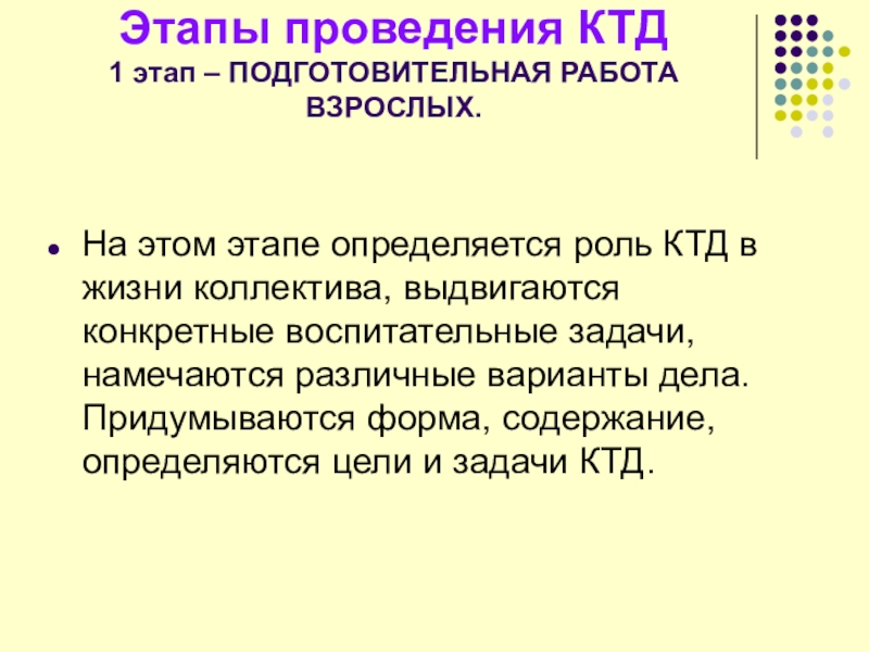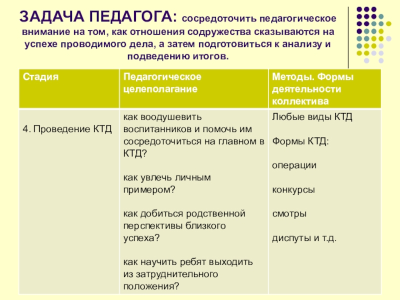 роль КТД в жизни коллектива, выдвигаются конкретные воспитательные задачи, намечаются различные варианты дела. Придумываются форма, содержание, определяются цели и задачи КТД.