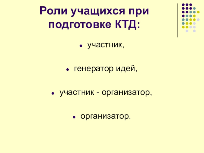 Слайд 6Роли учащихся при подготовке КТД: