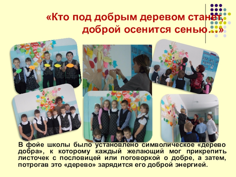 установлено символическое «дерево добра», к которому каждый желающий мог прикрепить листочек с пословицей или поговоркой о добре, а затем, потрогав это «дерево» зарядится его доброй энергией.