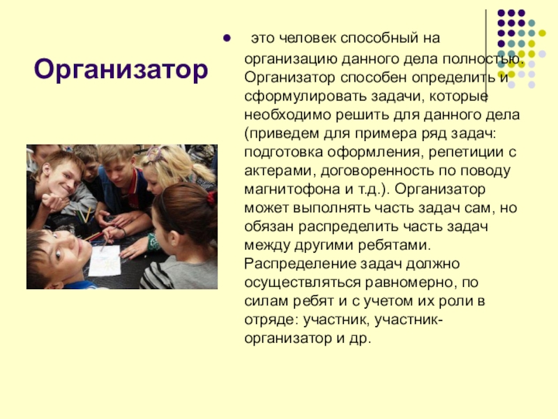 способен определить и сформулировать задачи, которые необходимо решить для данного дела (приведем для примера ряд задач: подготовка оформления, репетиции с актерами, договоренность по поводу магнитофона и т.д.). Организатор может выполнять часть задач сам, но обязан распределить часть задач между другими ребятами. Распределение задач должно осуществляться равномерно, по силам ребят и с учетом их роли в отряде: участник, участник-организатор и др.