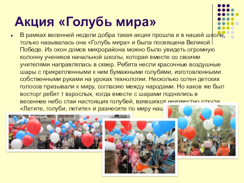в нашей школе, только называлась она «Голубь мира» и была посвящена Великой Победе. Из окон домов микрорайона можно было увидеть огромную колонну учеников начальной школы, которая вместе со своими учителями направлялась в сквер. Ребята несли красочные воздушные шары с прикрепленными к ним бумажными голубями, изготовленными собственными руками на уроках технологии. Несколько сотен детских голосов призывали к миру, согласию между народами. Но каков же был восторг ребят т взрослых, когда вместе с шарами поднялись в весеннее небо стаи настоящих голубей, взявшихся неизвестно откуда. «Летите, голуби, летите» и разнесите по миру нашу мечту о мире и дружбе!