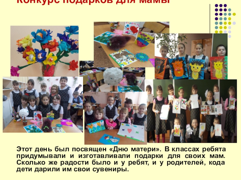 ребята придумывали и изготавливали подарки для своих мам. Сколько же радости было и у ребят, и у родителей, кода дети дарили им свои сувениры.