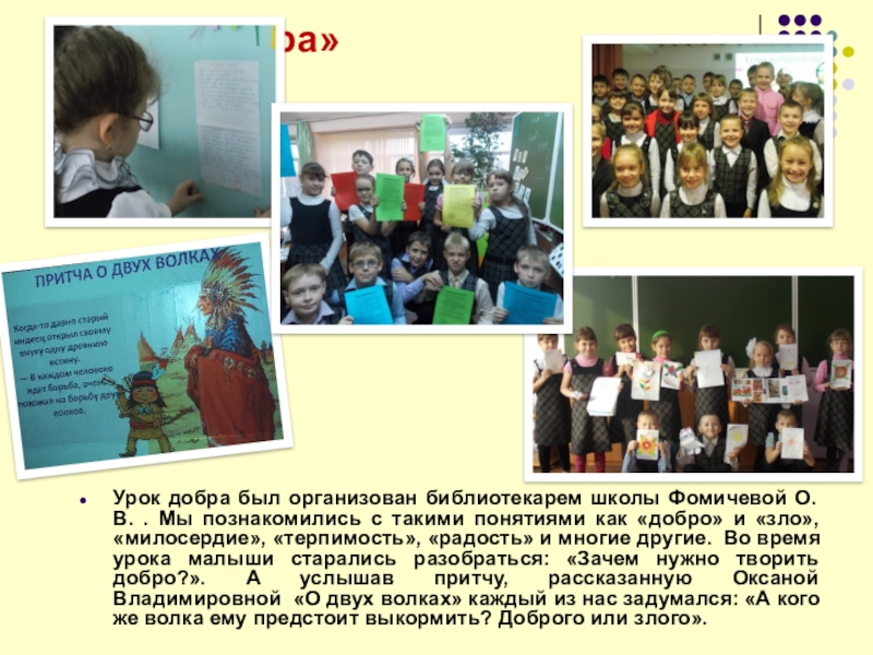 Мы познакомились с такими понятиями как «добро» и «зло», «милосердие», «терпимость», «радость» и многие другие. Во время урока малыши старались разобраться: «Зачем нужно творить добро?». А услышав притчу, рассказанную Оксаной Владимировной «О двух волках» каждый из нас задумался: «А кого же волка ему предстоит выкормить? Доброго или злого».