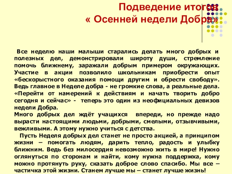 Пусть Неделя добрых дел станет не просто акцией, а принципом жизни – помогать людям, дарить тепло, радость и улыбку ближним. Ведь без милосердия невозможно жить в мире! Нужно оглянуться по сторонам и найти, кому нужна поддержка, кому можно протянуть руку, сказать доброе слово спасибо. Мы все – частичка этой жизни. Станем лучше мы – станет лучше жизнь!