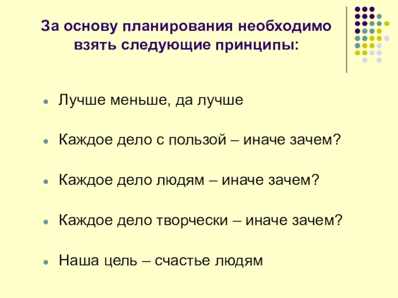 За основу планирования необходимо взять следующие принципы: