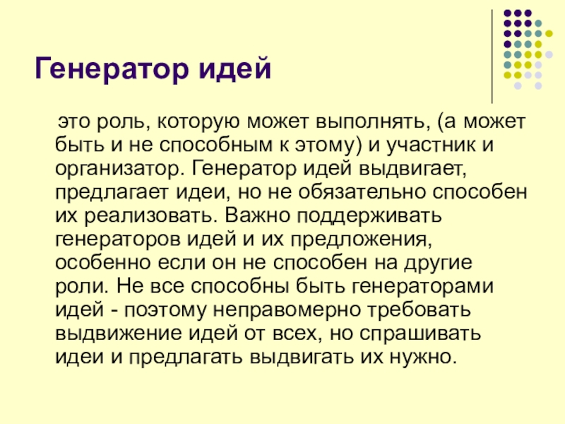 быть и не способным к этому) и участник и организатор. Генератор идей выдвигает, предлагает идеи, но не обязательно способен их реализовать. Важно поддерживать генераторов идей и их предложения, особенно если он не способен на другие роли. Не все способны быть генераторами идей - поэтому неправомерно требовать выдвижение идей от всех, но спрашивать идеи и предлагать выдвигать их нужно.