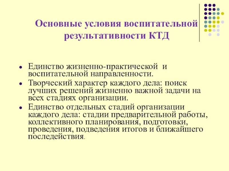 Слайд 33Основные условия воспитательной результативности КТД