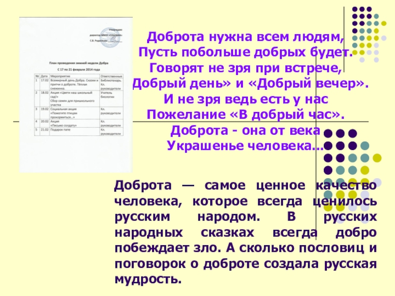 Доброта — самое ценное качество человека, которое всегда ценилось русским народом. В русских народных сказках всегда добро побеждает зло. А сколько пословиц и поговорок о доброте создала русская мудрость.