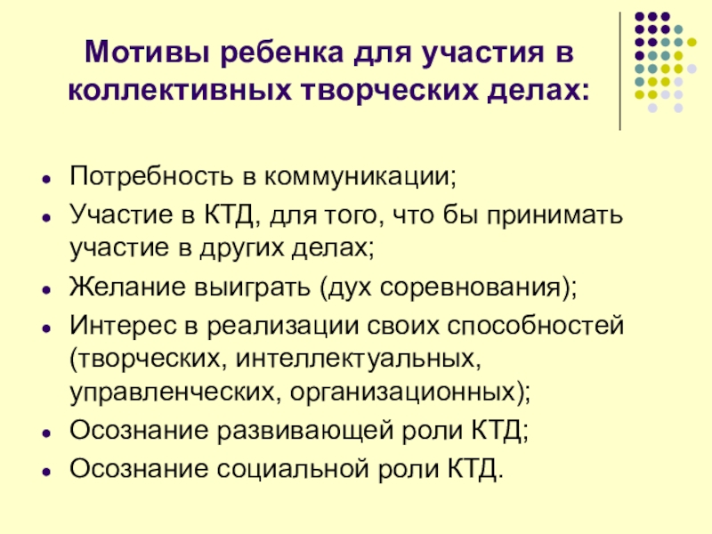 Слайд 5Мотивы ребенка для участия в коллективных творческих делах: