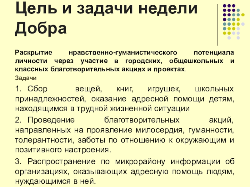 Слайд 31Цель и задачи недели Добра