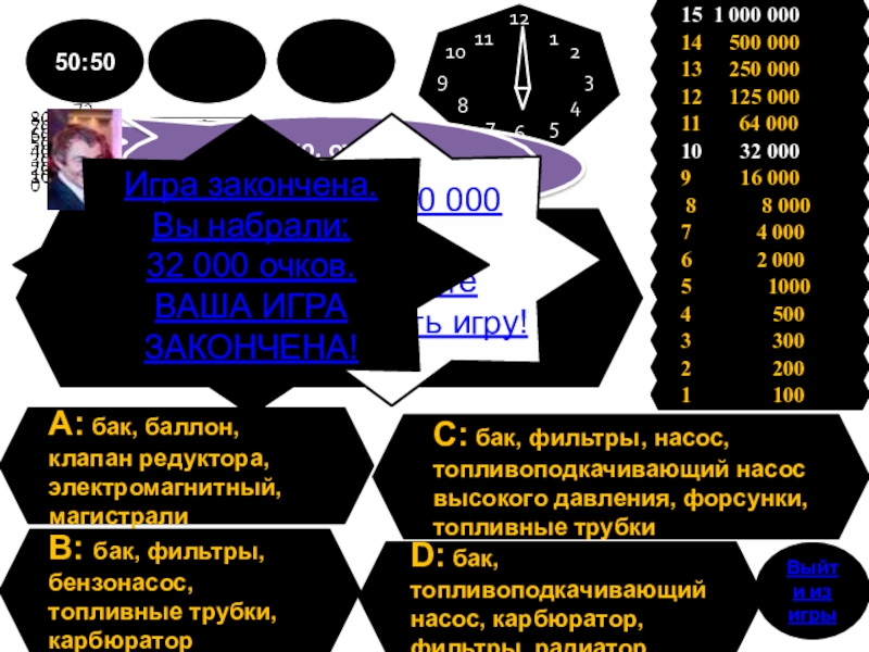 D: бак, топливоподкачивающий насос, карбюратор, фильтры, радиатор