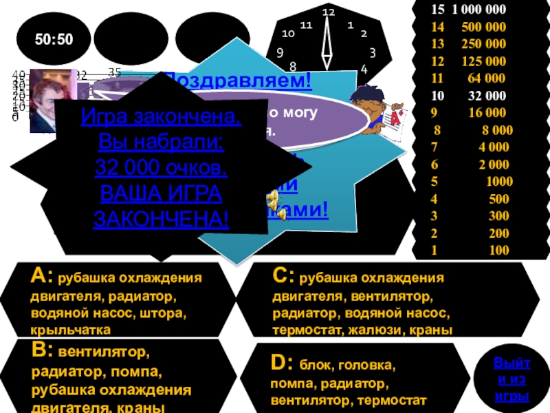 B: вентилятор, радиатор, помпа, рубашка охлаждения двигателя, краны