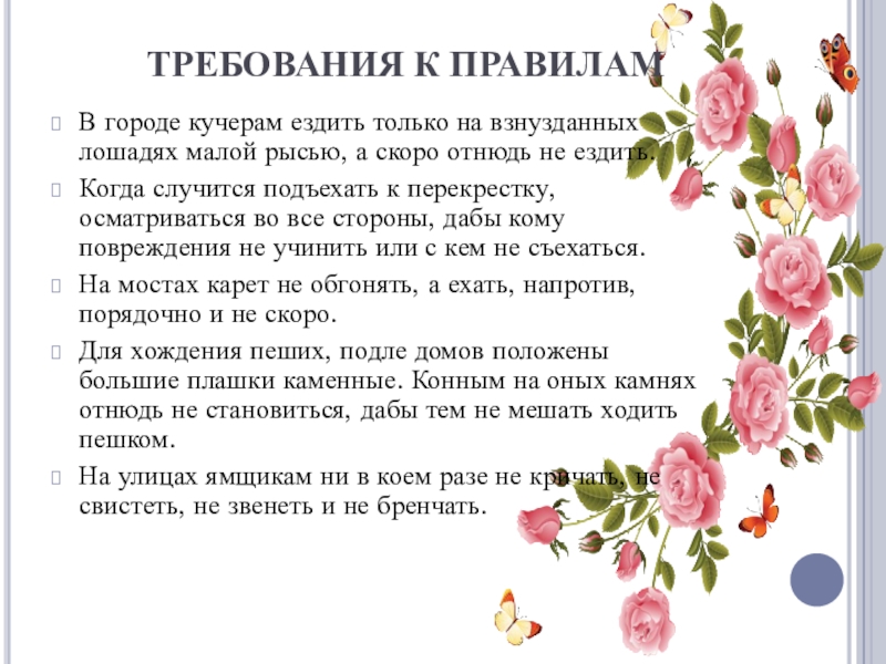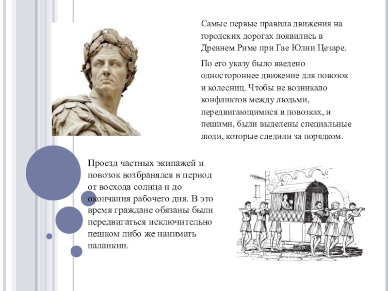 Проезд частных экипажей и повозок возбранялся в период от восхода солнца и до окончания рабочего дня. В это время граждане обязаны были передвигаться исключительно пешком либо же нанимать паланкин.