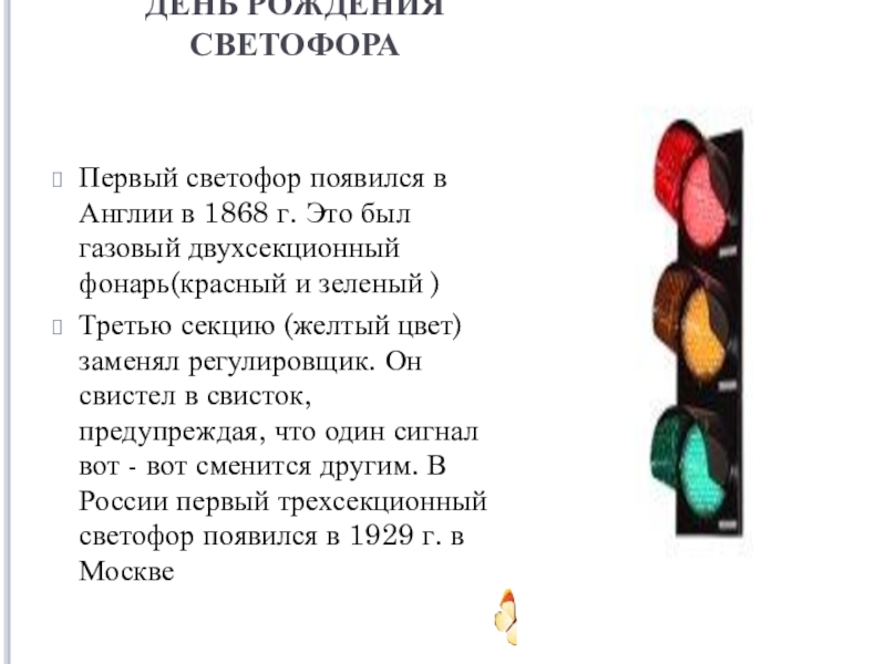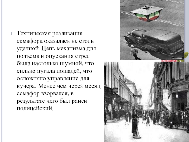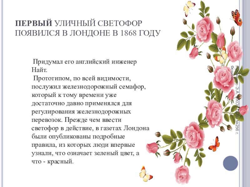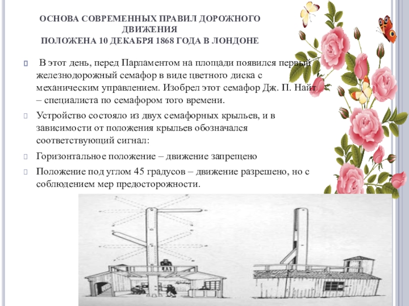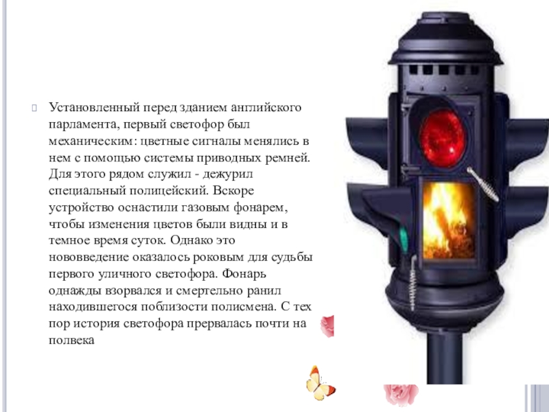 Прототипом, по всей видимости, послужил железнодорожный семафор, который к тому времени уже достаточно давно применялся для регулирования железнодорожных перевозок. Прежде чем ввести светофор в действие, в газетах Лондона были опубликованы подробные правила, из которых люди впервые узнали, что означает зеленый цвет, а что - красный.
