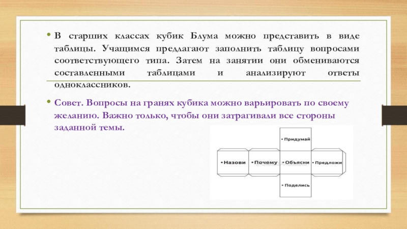 Прием развития критического мышления «Кубик Блума» уникален тем, что позвояет