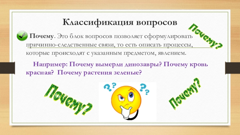 Например: Почему вымерли динозавры? Почему кровь красная? Почему растения зеленые?