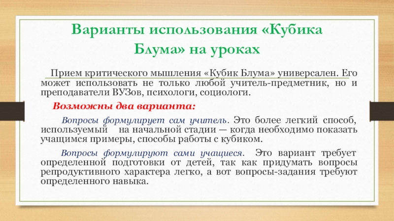Слайд 12Варианты использования «Кубика Блума» на уроках