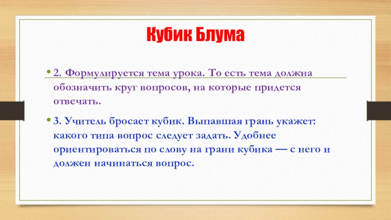 Вопросы формулирует сам учитель. Это более легкий способ, используемый на начальной стадии — когда необходимо показать учащимся примеры, способы работы с кубиком.