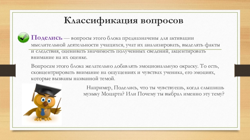 Вопросам этого блока желательно добавлять эмоциональную окраску. То есть, сконцентрировать внимание на ощущениях и чувствах ученика, его эмоциях, которые вызваны названной темой.