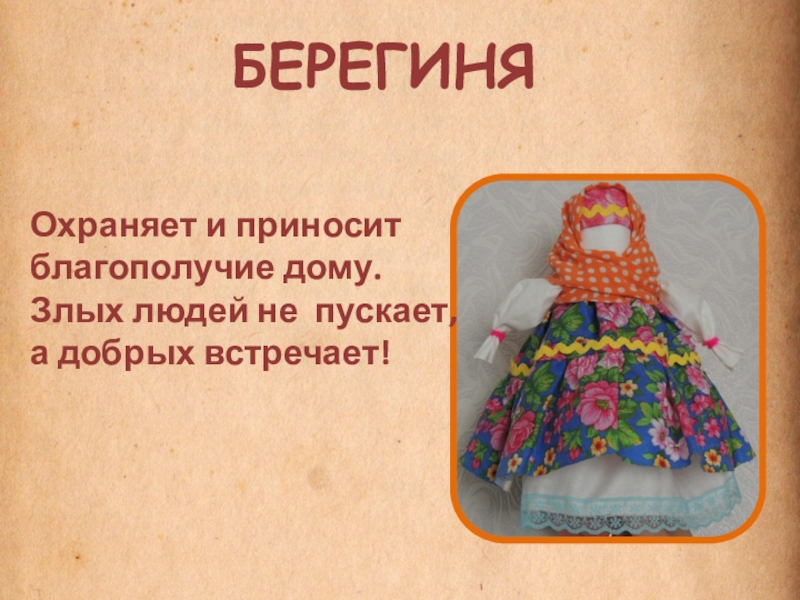 БЕРЕГИНЯОхраняет и приносит благополучие дому. Злых людей не пускает, а добрых встречает!