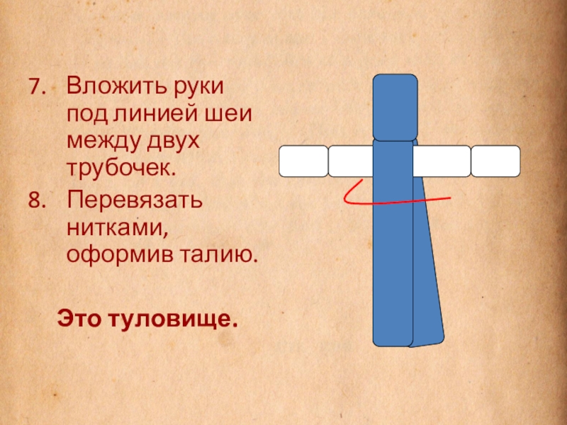 Вложить руки под линией шеи между двух трубочек.Перевязать нитками, оформив талию. Это туловище.