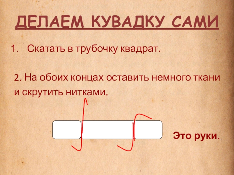 ДЕЛАЕМ КУВАДКУ САМИСкатать в трубочку квадрат. 2. На обоих концах оставить немного ткани и скрутить нитками.Это руки.