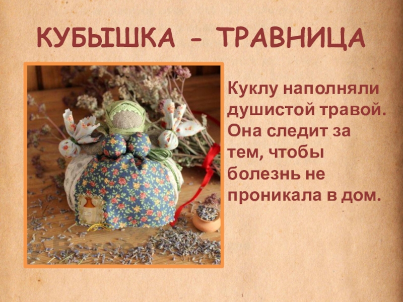 КУБЫШКА - ТРАВНИЦАКуклу наполняли душистой травой. Она следит за тем, чтобы болезнь не проникала в дом.