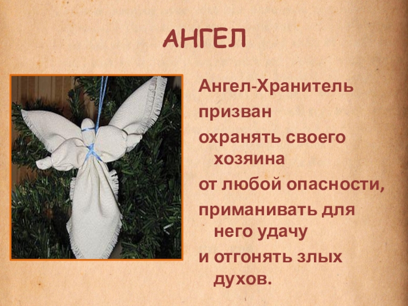 АНГЕЛАнгел-Хранительпризван охранять своего хозяина от любой опасности, приманивать для него удачу и отгонять злых духов.