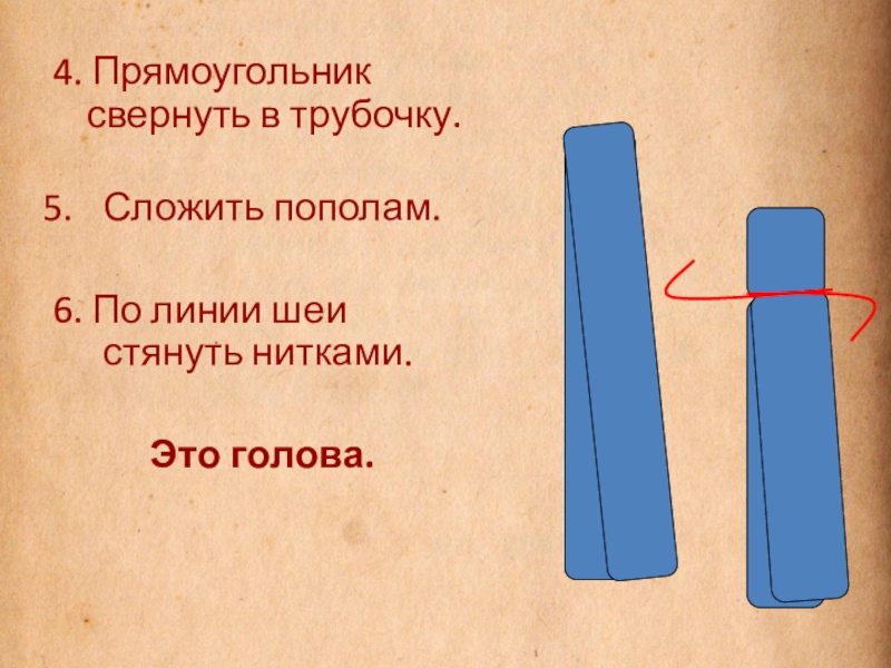 4. Прямоугольник свернуть в трубочку. Сложить пополам. 6. По линии шеи стянуть нитками. Это голова.