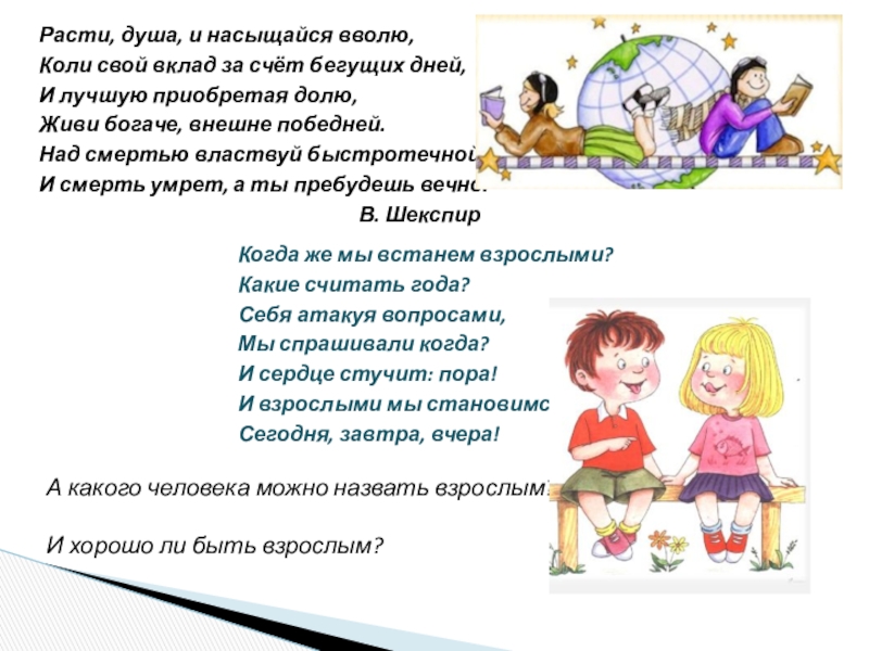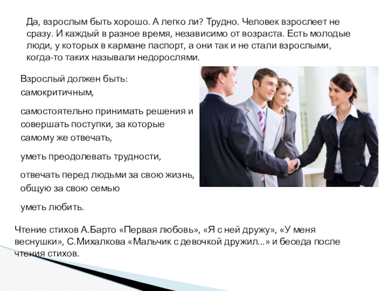 Да, взрослым быть хорошо. А легко ли? Трудно. Человек взрослеет не сразу. И каждый в разное время, независимо от возраста. Есть молодые люди, у которых в кармане паспорт, а они так и не стали взрослыми, когда-то таких называли недорослями.
