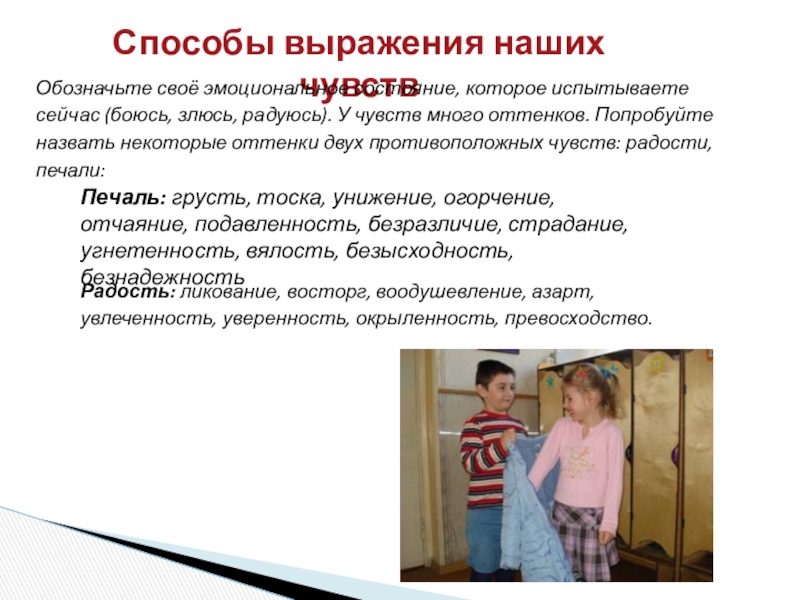 Обозначьте своё эмоциональное состояние, которое испытываете сейчас (боюсь, злюсь, радуюсь). У чувств много оттенков. Попробуйте назвать некоторые оттенки двух противоположных чувств: радости, печали: