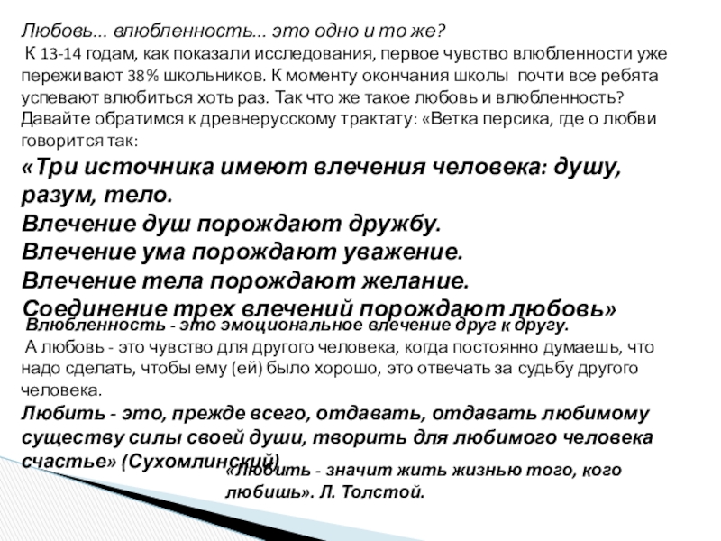 Любить - это, прежде всего, отдавать, отдавать любимому существу силы своей души, творить для любимого человека счастье» (Сухомлинский)