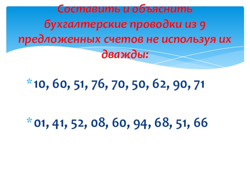 Составить и объяснить бухгалтерские проводки из 9 предложенных счетов не используя их дважды: