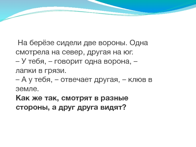 Слайд 6 На берёзе сидели две вороны. Одна смотрела на север, другая