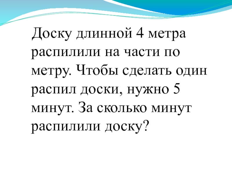 Слайд 5 Доску длинной 4 метра распилили на части по метру. Чтобы