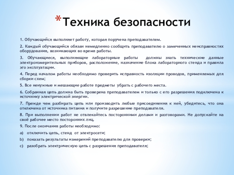 3. Обучающиеся, выполняющие лабораторные работы должны знать технические данные электроизмерительных приборов, расположение, назначение блока лабораторного стенда и правила эго эксплуатации.