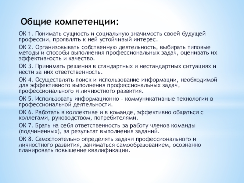 Общие компетенции:ОК 1. Понимать сущность и социальную значимость своей будущей профессии, проявлять к ней устойчивый интерес.ОК 2.