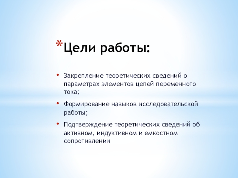 Цели работы:Закрепление теоретических сведений о параметрах элементов цепей переменного тока;Формирование навыков исследовательской работы;Подтверждение теоретических сведений об активном,