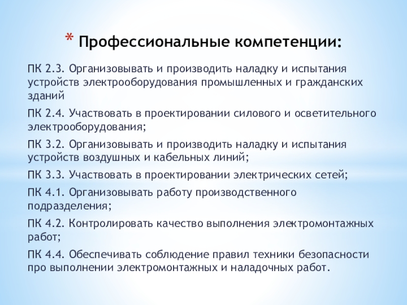 Профессиональные компетенции:ПК 2.3. Организовывать и производить наладку и испытания устройств электрооборудования промышленных и гражданских зданий ПК 2.4.