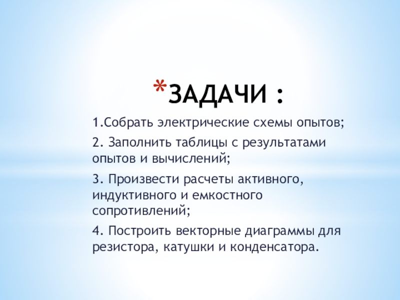 ЗАДАЧИ :1.Собрать электрические схемы опытов;2. Заполнить таблицы с результатами опытов и вычислений;3. Произвести расчеты активного, индуктивного и