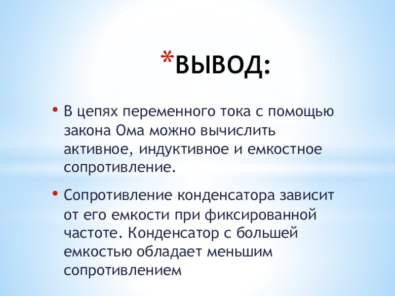 ВЫВОД:В цепях переменного тока с помощью закона Ома можно вычислить активное, индуктивное и емкостное сопротивление.Сопротивление конденсатора зависит