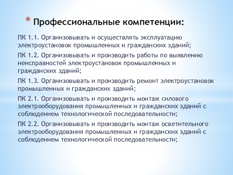 Профессиональные компетенции:ПК 1.1. Организовывать и осуществлять эксплуатацию электроустановок промышленных и гражданских зданий;ПК 1.2. Организовывать и производить работы