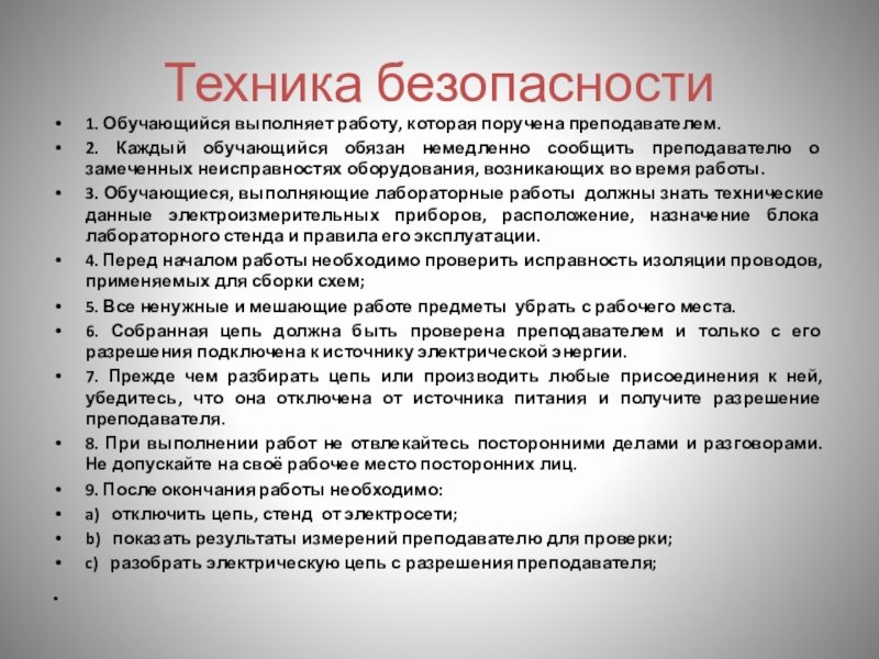 3. Обучающиеся, выполняющие лабораторные работы должны знать технические данные электроизмерительных приборов, расположение, назначение блока лабораторного стенда и правила его эксплуатации.