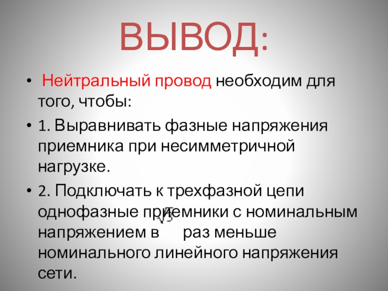 ВЫВОД: Нейтральный провод необходим для того, чтобы:1. Выравнивать фазные напряжения приемника при несимметричной нагрузке.2. Подключать к трехфазной