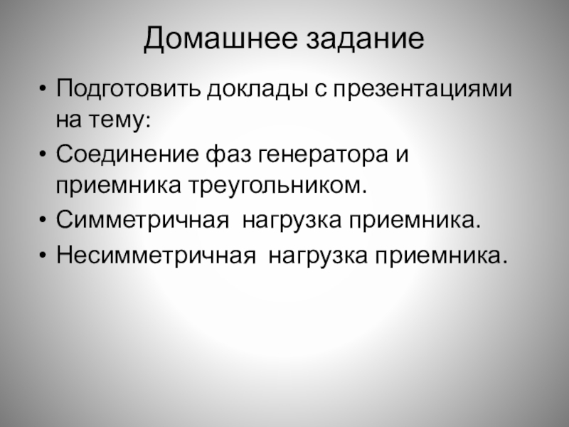 Домашнее заданиеПодготовить доклады с презентациями на тему:Соединение фаз генератора и приемника треугольником. Симметричная нагрузка приемника. Несимметричная нагрузка