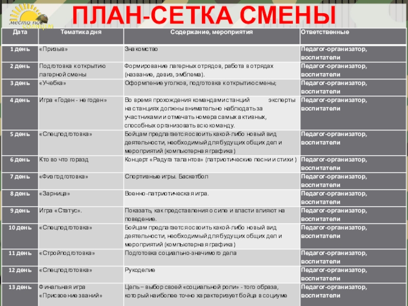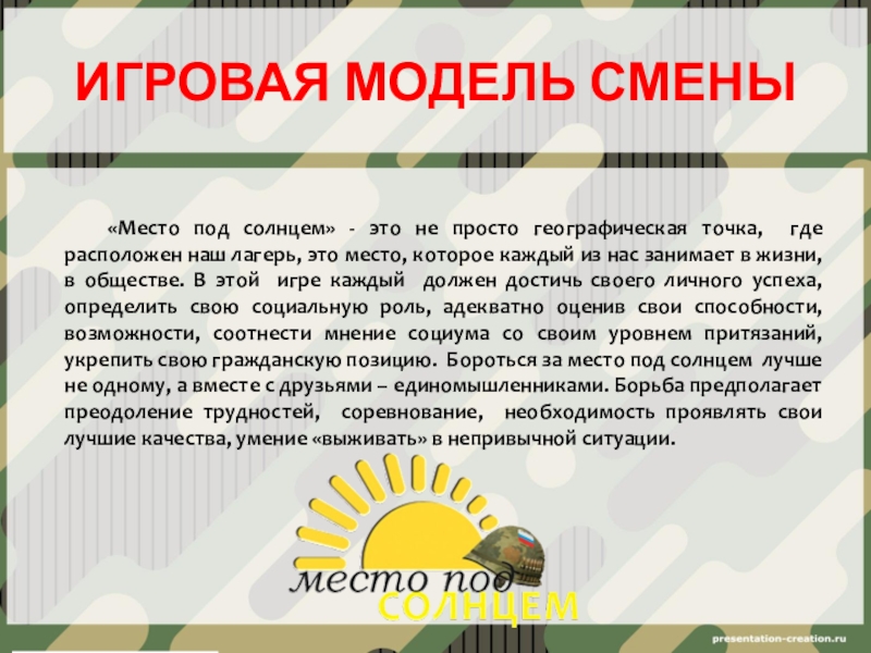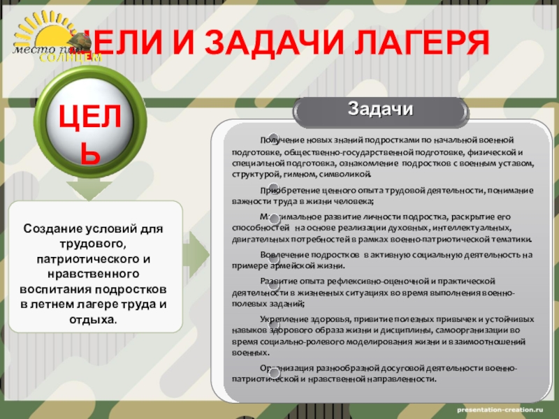 Укрепление здоровья, привитие полезных привычек и устойчивых навыков здорового образа жизни и дисциплины, самоорганизации во время социально-ролевого моделирования жизни и взаимоотношений военных.