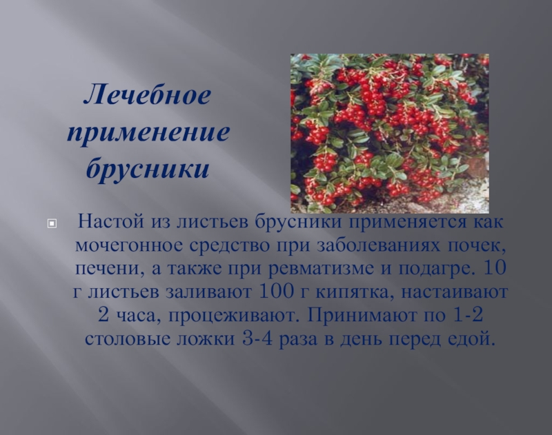 Слайд 5 Брусника по праву считается лекарственным растением, целебны и