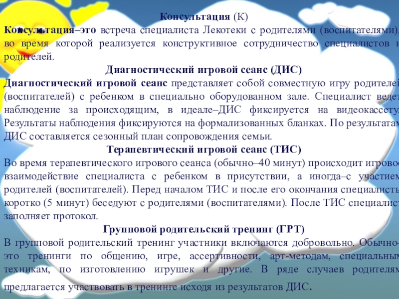 Консультация–это встреча специалиста Лекотеки с родителями (воспитателями), во время которой