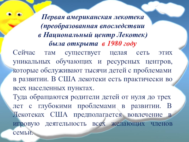 Туда обращаются родители детей от нуля до трех лет с глубокими проблемами в развитии. В Лекотеках США предполагается вовлечение в игровую деятельность всех желающих членов семьи.
