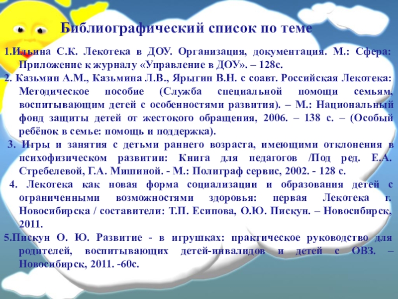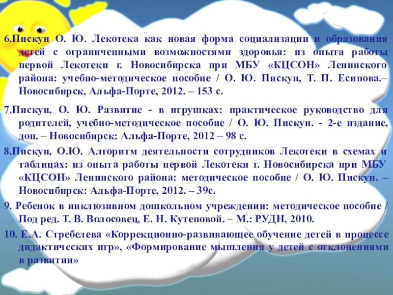 4. Лекотека как новая форма социализации и образования детей с ограниченными возможностями здоровья: первая Лекотека г. Новосибирска / составители: Т.П. Есипова, О.Ю. Пискун. – Новосибирск, 2011.
